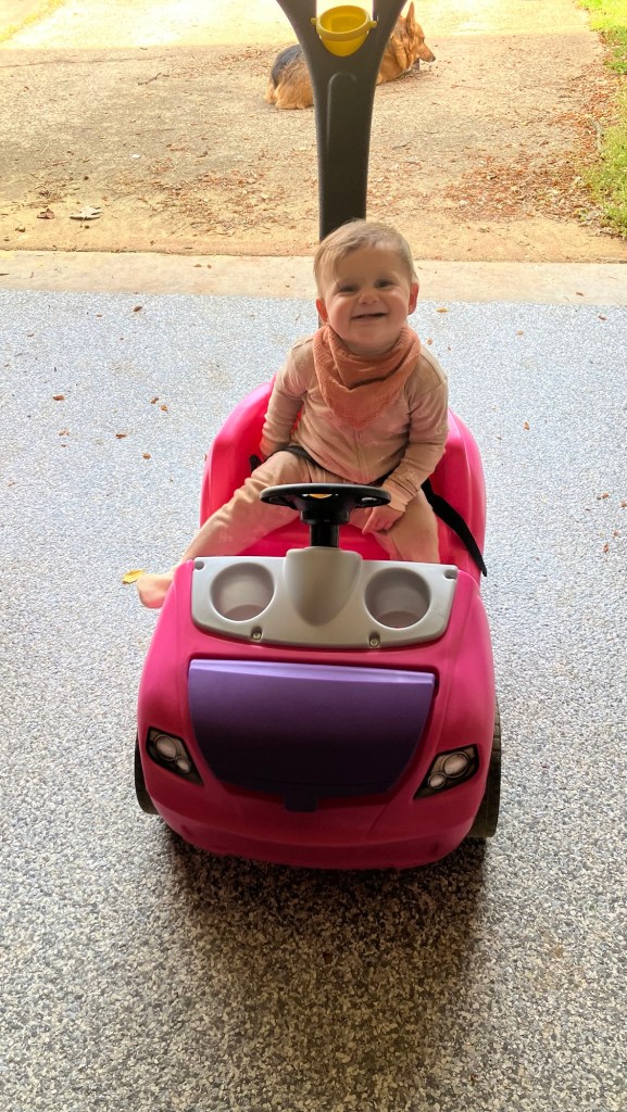 We are having so much fun watching you grow, and can’t believe that you are One year old already! Pop Pop loves taking you for your walk in your cute pink car and he told us all about how you love to pick flowers off the trees as you pass them by.